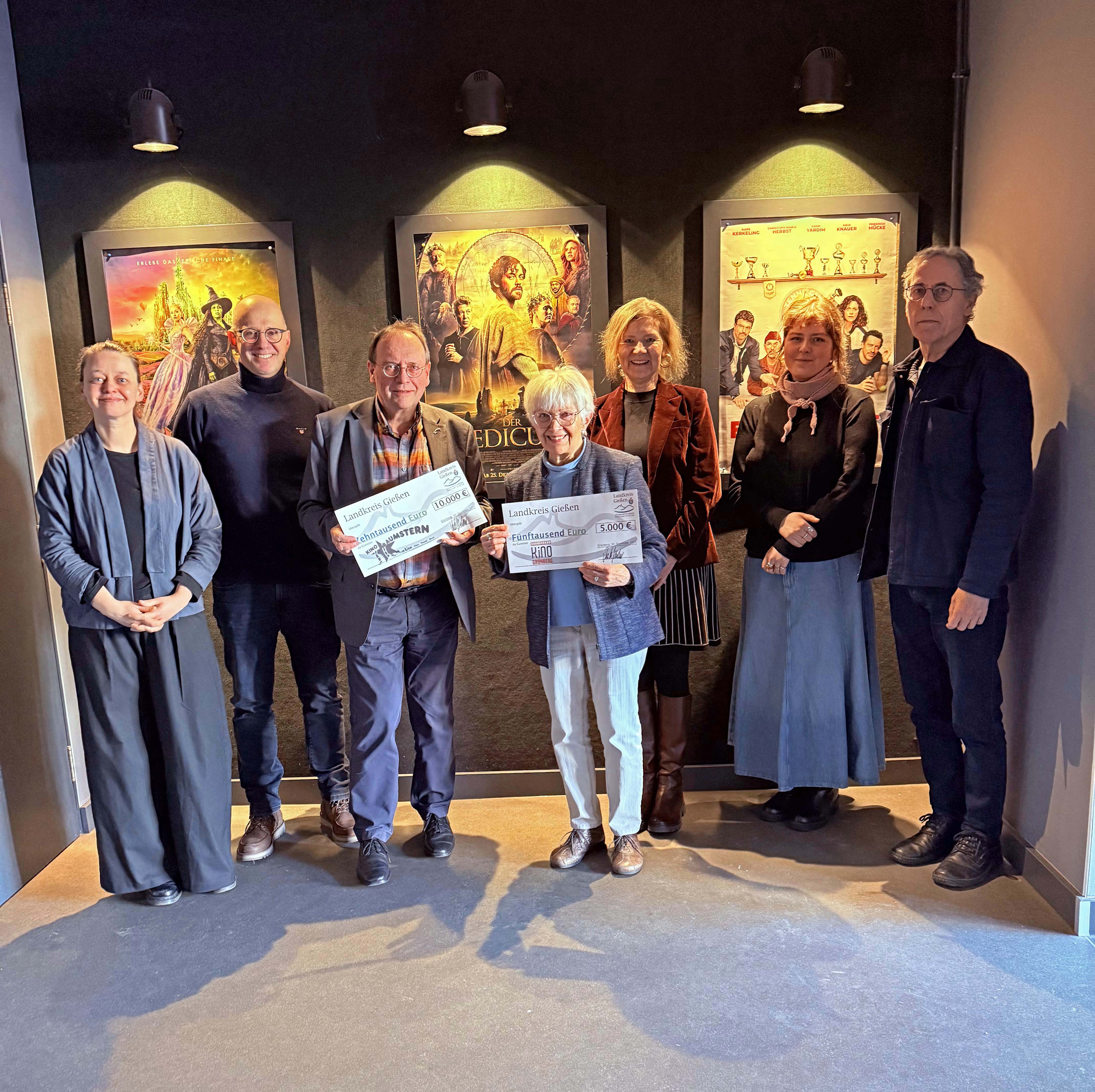 Einen symbolischen Scheck über 5.000 Euro für das Kino Grünberg und einen über 10.000 Euro für das Kino Traumstern in Lich übergab Landrätin Anita Schneider kürzlich an die Lichtspielhaus-Betreiberin in Grünberg Edith Weber sowie an Hans Gsänger und Edgar Langer vom Kino Traumstern.