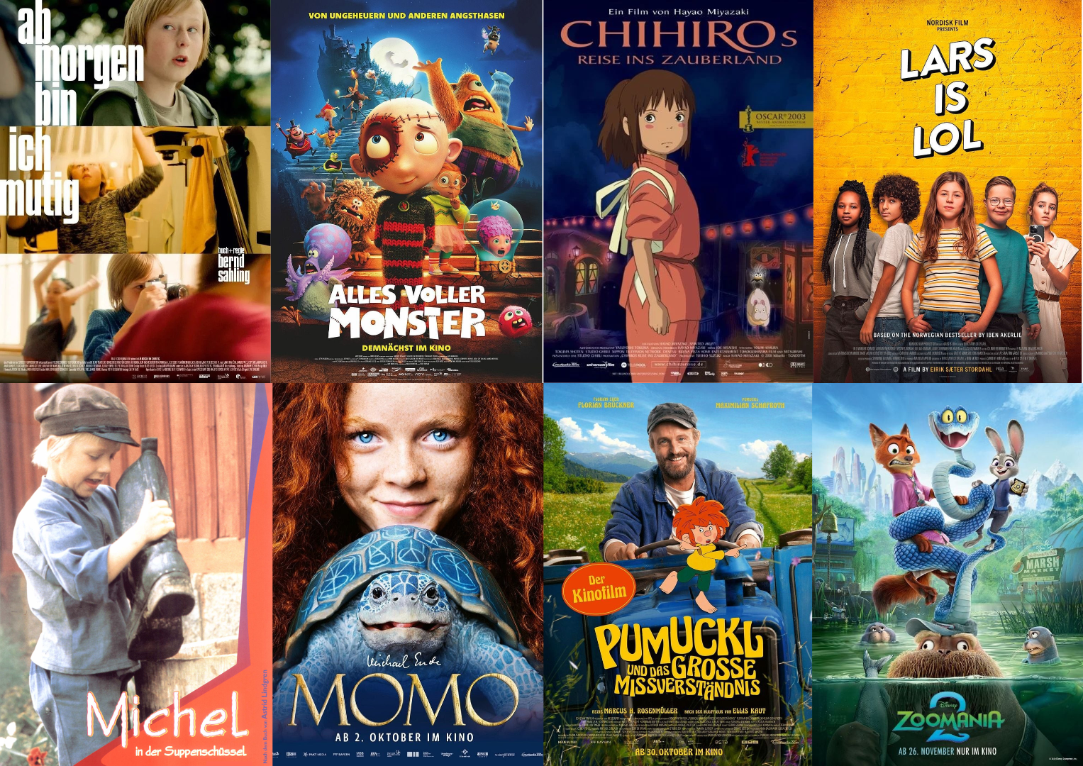 - AB MORGEN BIN ICH MUTIG - ALLES VOLLER MONSTER - CHIHIROS REISE INS ZAUBERLAND - LARS IST LOL - MICHEL IN DER SUPPENSCHÜSSEL - PUMUCKL UND DAS GROSSE MISSVERSTÄNDNIS - ZOOMANIA 2